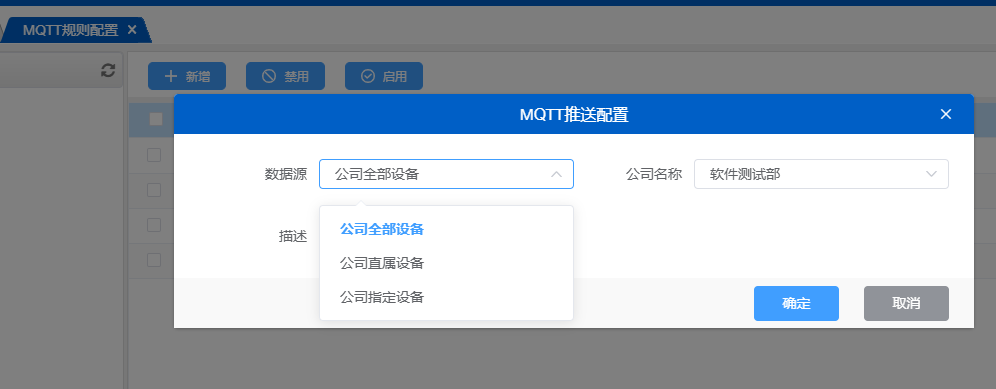 用户可以在此界面中,配置需要进行MQTT推送的终端,通过选择数据源,可以进行多方式的选择所需要推送的终端。