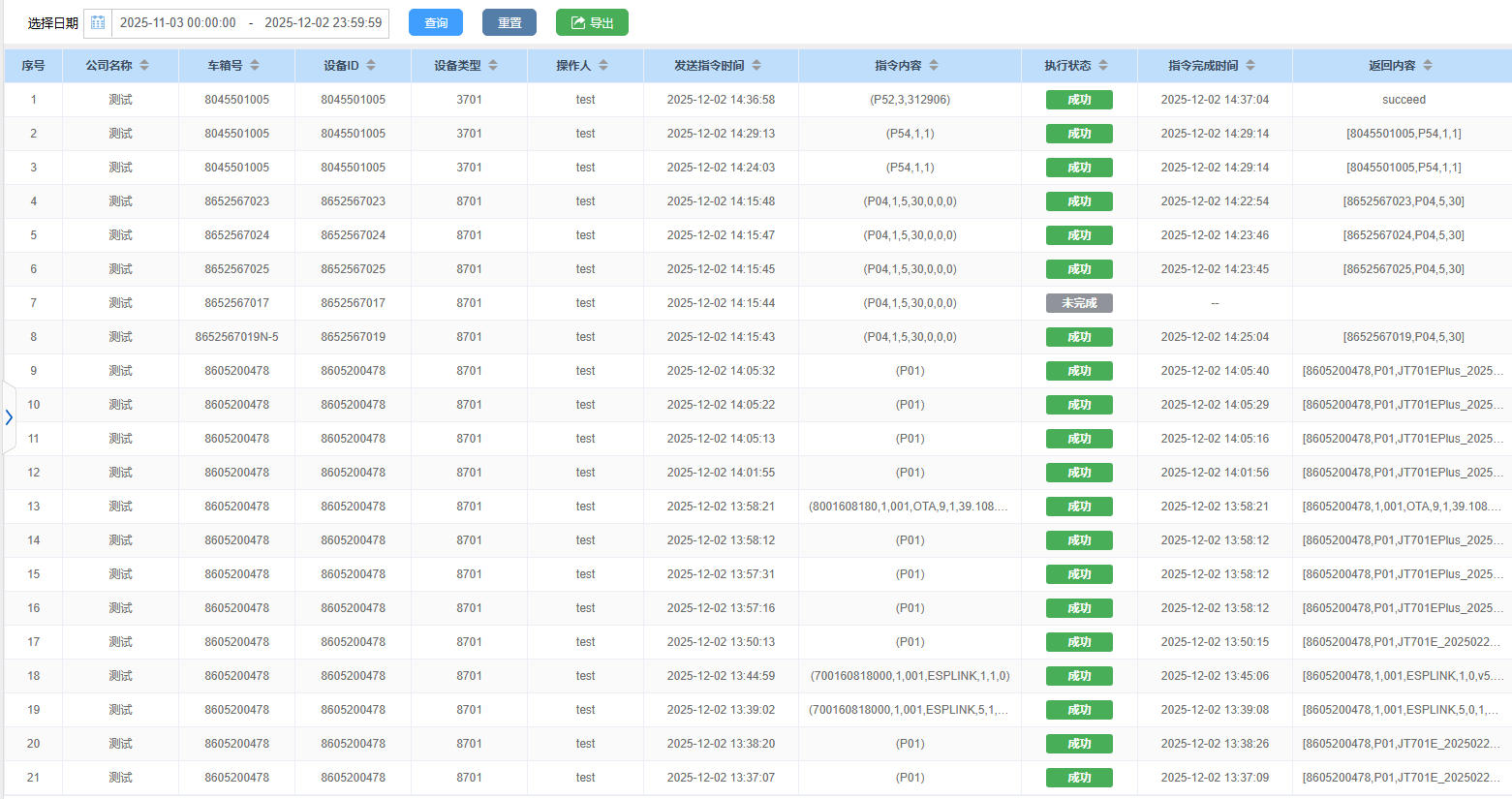 • 执行状态:指令下发结果(如成功、失败),便于校验指令执行情况。