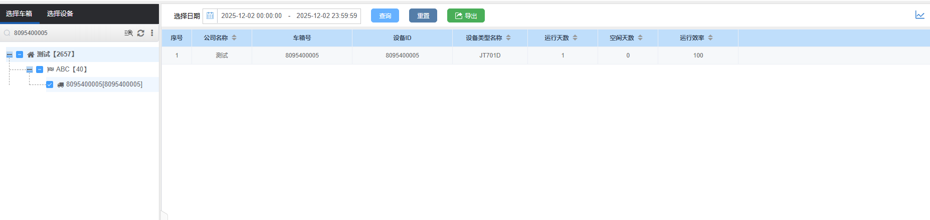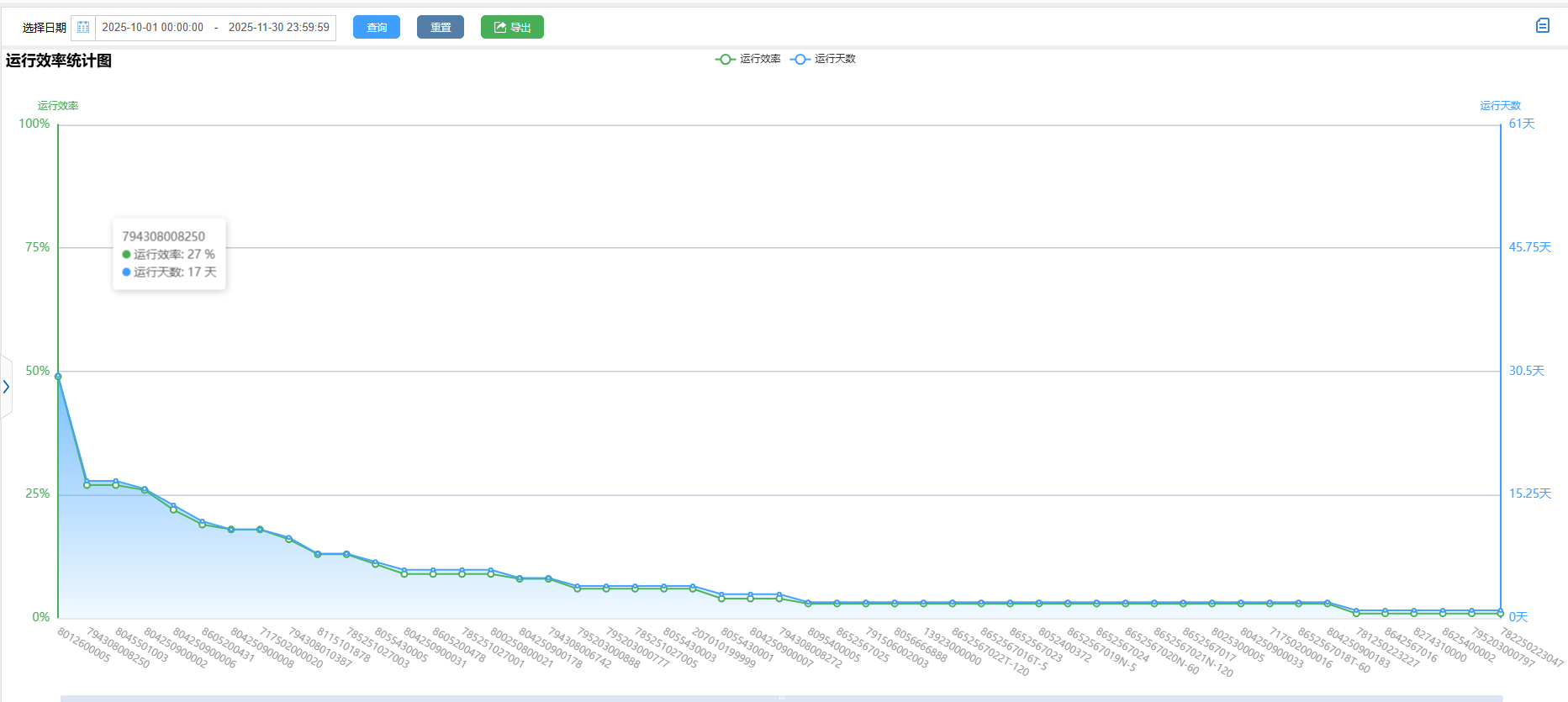 查询后默认展示列表视图,清晰呈现各设备的核心效率数据,包括设备编号、运行天数、运行效率值等关键指标,便于精准提取单设备或多设备的具体数值,适配精细化分析与数据归档。