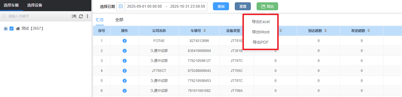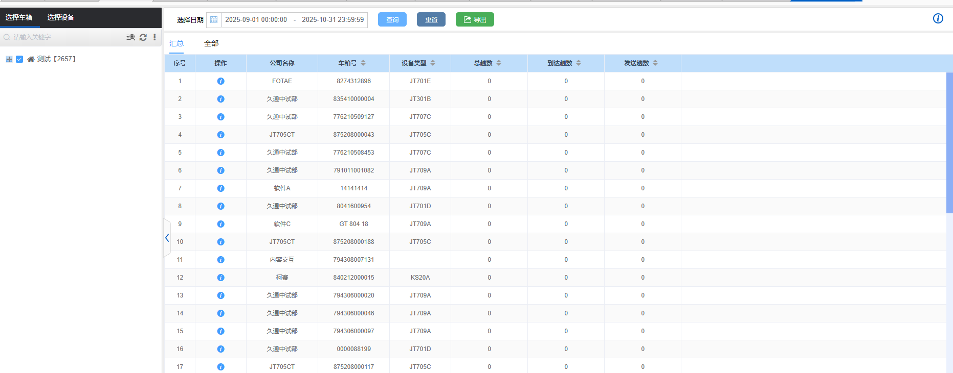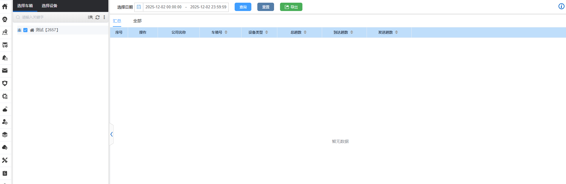 点击 “查询” 按钮,系统按选定公司和时间范围,筛选展示运输趟次数据(含公司名称、车箱号、设备类型、总趟数、到达趟数、发送趟数等);