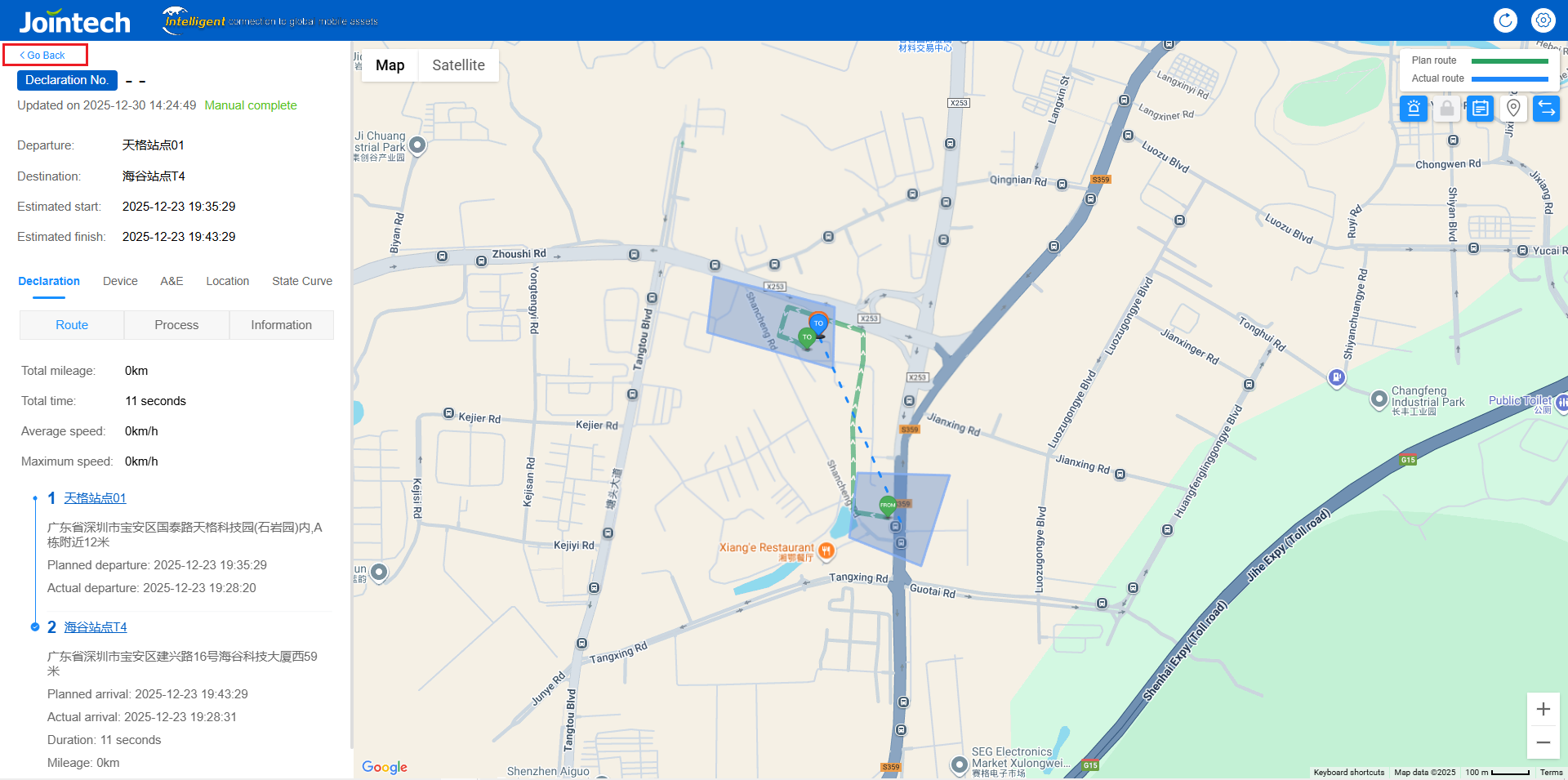 The completed tasks will display the actual departure time, actual arrival time, and completion time, and you can intuitively see the operation of the vehicle.
