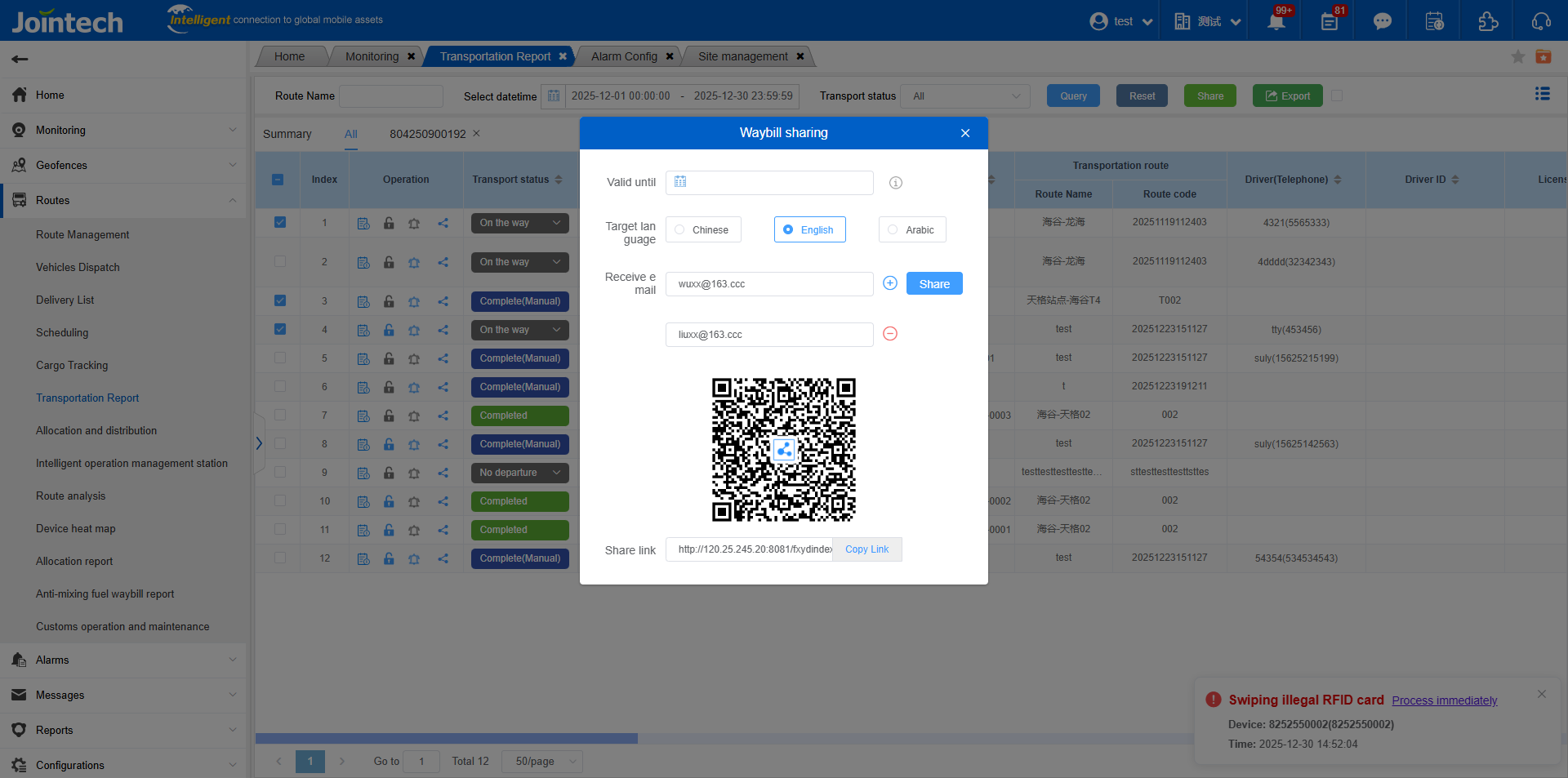 Added Multiple Waybill Sharing: You can select multiple waybills in the report, click “Share,” fill in the corresponding parameters to generate a sharing link or QR code, or share to multiple email addresses.