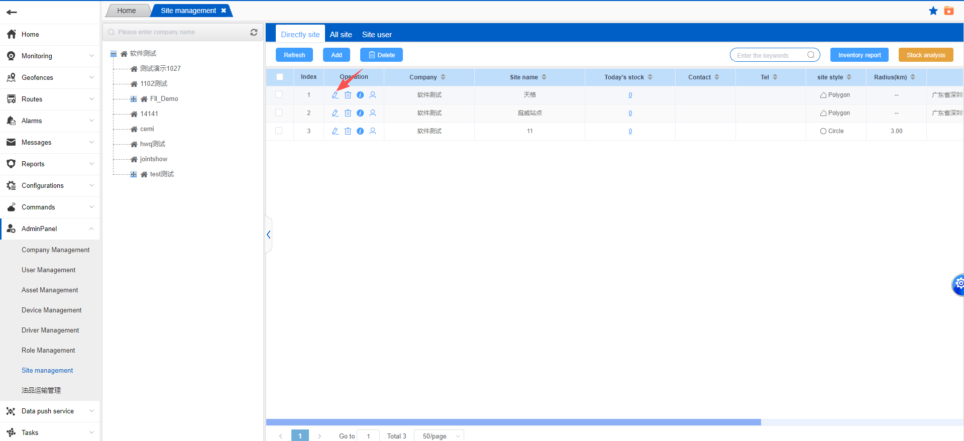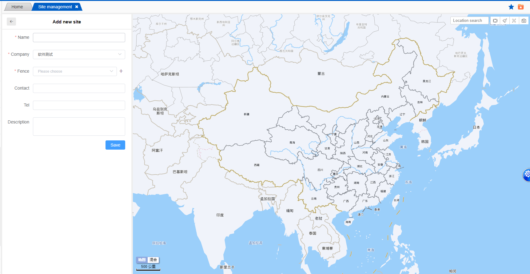 After the page redirects, the area of the site will be roughly determined in the upper right corner of the map and a fence will be drawn. Enter the site name, select the company to which the site belongs from the drop-down menu, and draw the fence. The fence can be circular or polygonal. Except for the required fields, other options can be filled in or saved. Once saved, the site will be successfully added.
