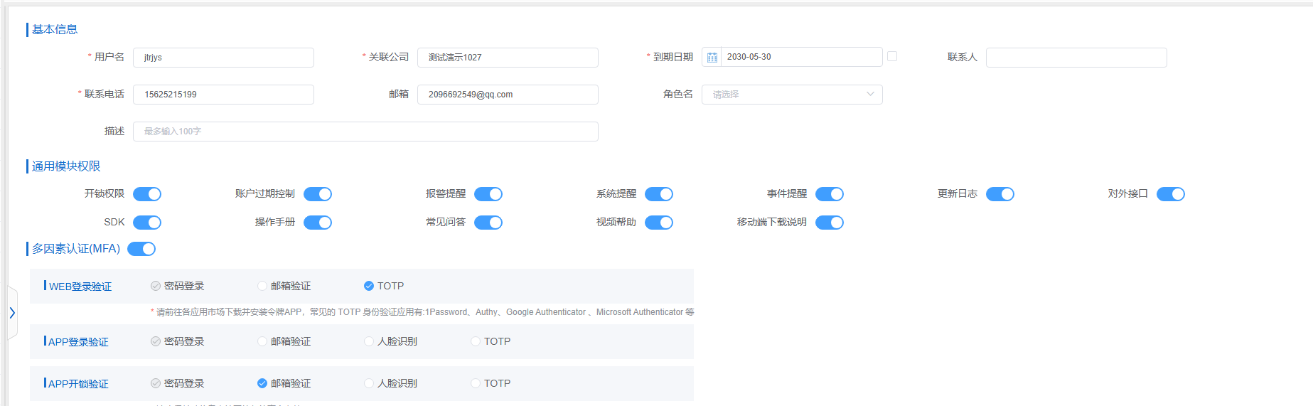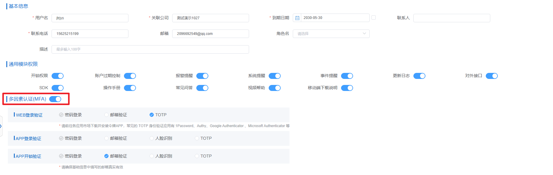 • WEB 登录验证;在 “WEB 登录验证” 区域,您可以选择 “邮箱验证” 方式,也可以不选(默认选择密码登录)。若选择 “邮箱验证”,请确保基础信息中填写的邮箱真实有效,以便能正常接收验证邮件。