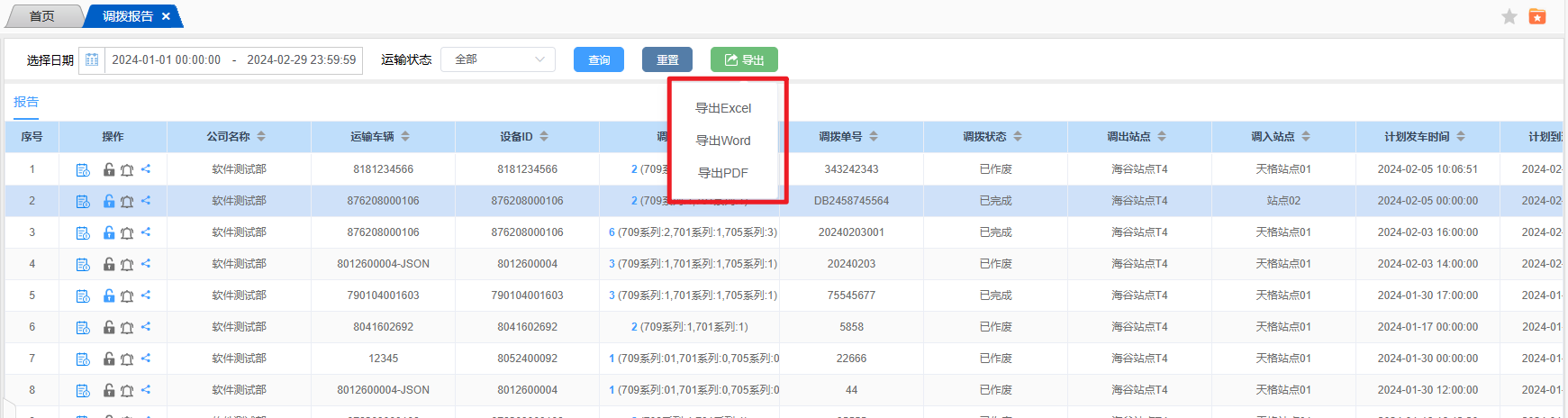 导出报告:如果您想将调拨报告保存到本地,点击 “导出” 按钮,在弹出的选项中选择您需要的导出格式,如 EXCEL、PDF、WORD ,系统将自动生成对应格式的文件并支持下载。