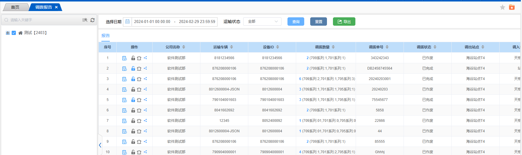 进入调拨报告页面:在页面内,您可以通过输入公司名称或设备相关信息,在搜索框进行搜索,快速定位您需要查看的调拨单报告详情。也可直接查看所有状态下的调拨单记录。