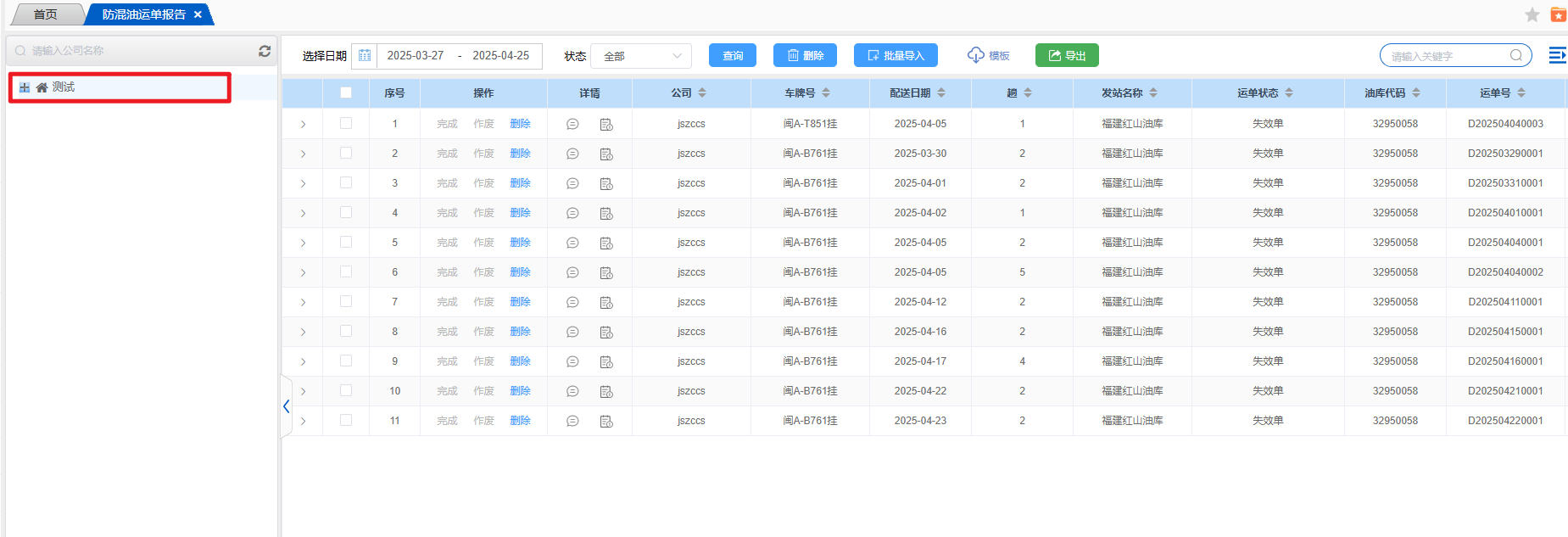 选择公司:在页面左侧的公司树结构中,点击展开节点,选择您要查看运单报告的公司,例如 “测试” 等。