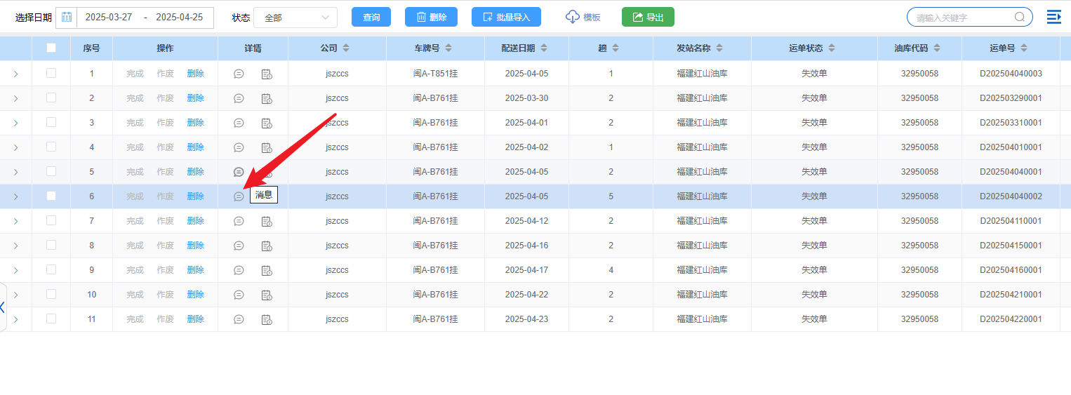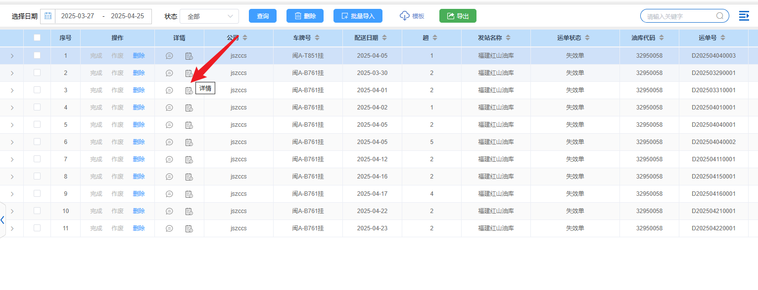 查看已完成运单详情和事件:对于 “运单状态” 为已完成的运单记录,点击该行的 “详情” 按钮,可查看该运单的详细信息,如发站名称、油库代码、运单号等;
