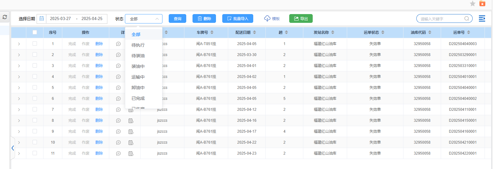 按运单状态筛选查询:在日期选择框右侧,点击 “状态” 下拉菜单,可选择 “全部”“有效单”“失效单” 等状态选项,筛选出对应