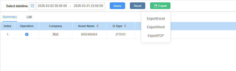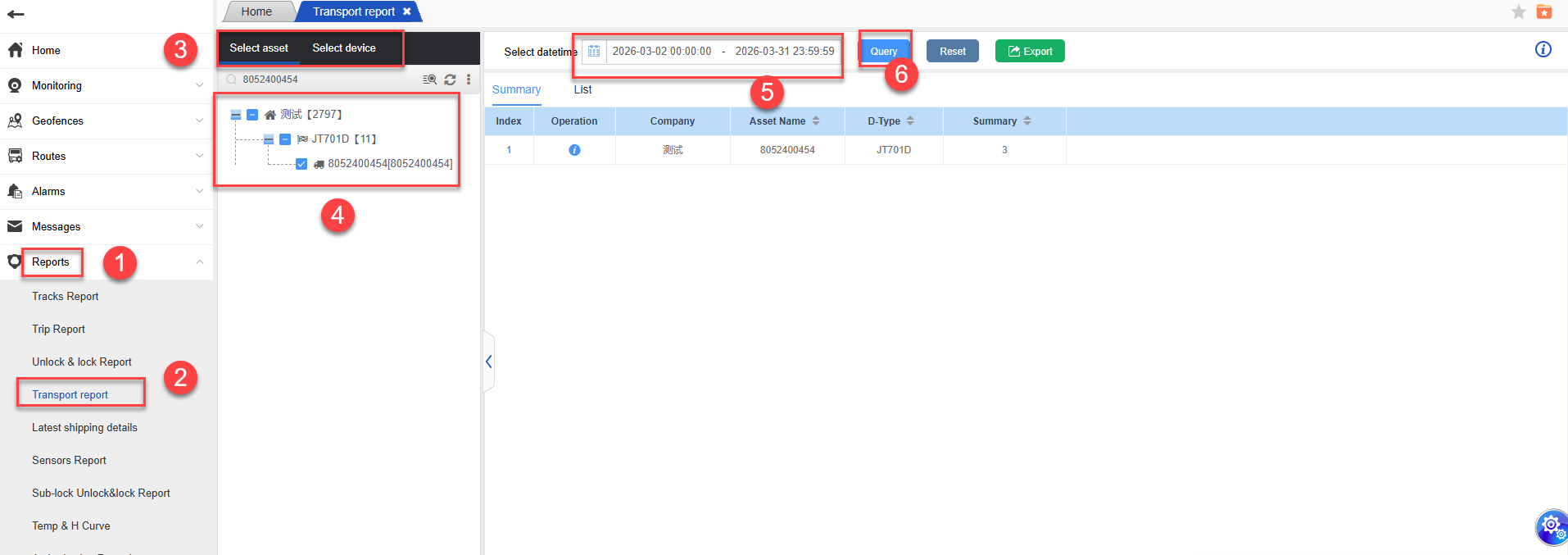 1、Operation steps: Reports -> Transport Report -> Select asset or device -> Select datetime and click “Query” to proceed. All the contents that meet the selected criteria will be displayed.