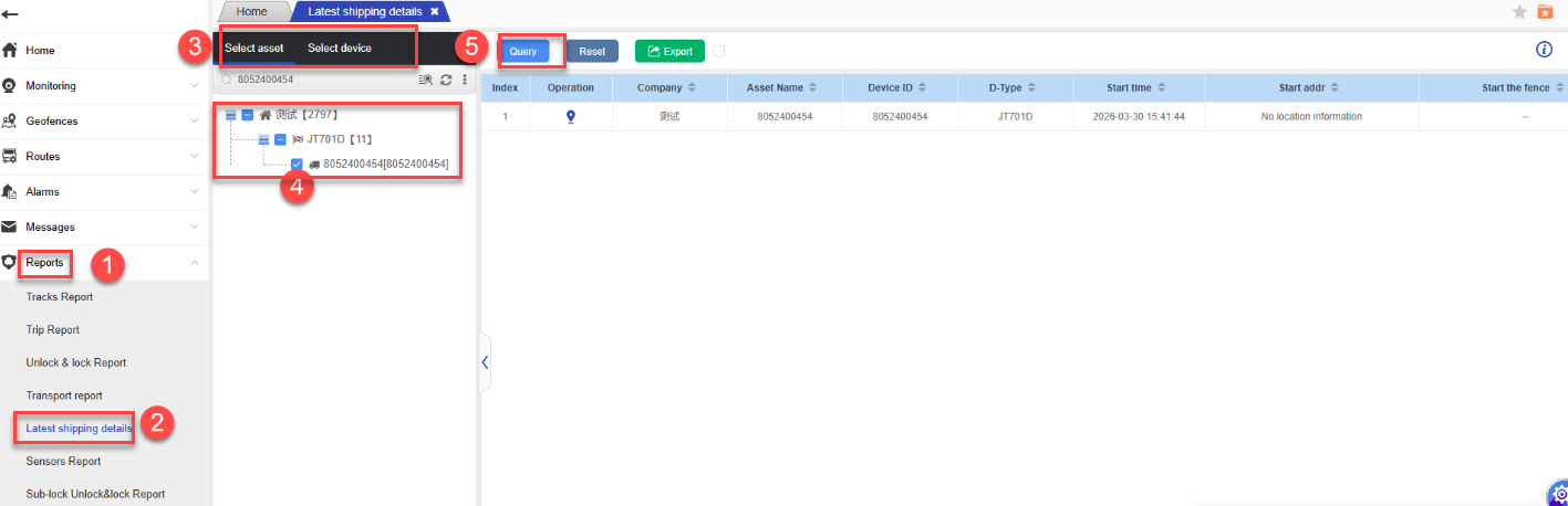 Operation steps: Reports -> Latest shipping details -> Select asset or device -> Click “Query”. All the information that meets the filtering conditions will be displayed.