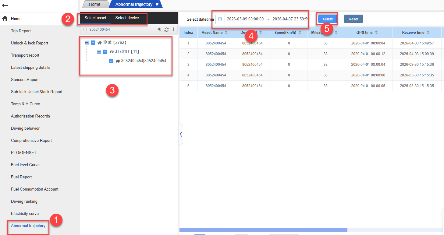 Operation steps: Reports -> Exception Trajectory Points -> Select asset or device -> Select date range -> Click “Query” to proceed. The abnormal trajectory data for the selected equipment will be displayed.