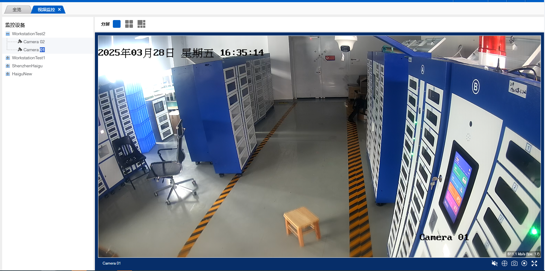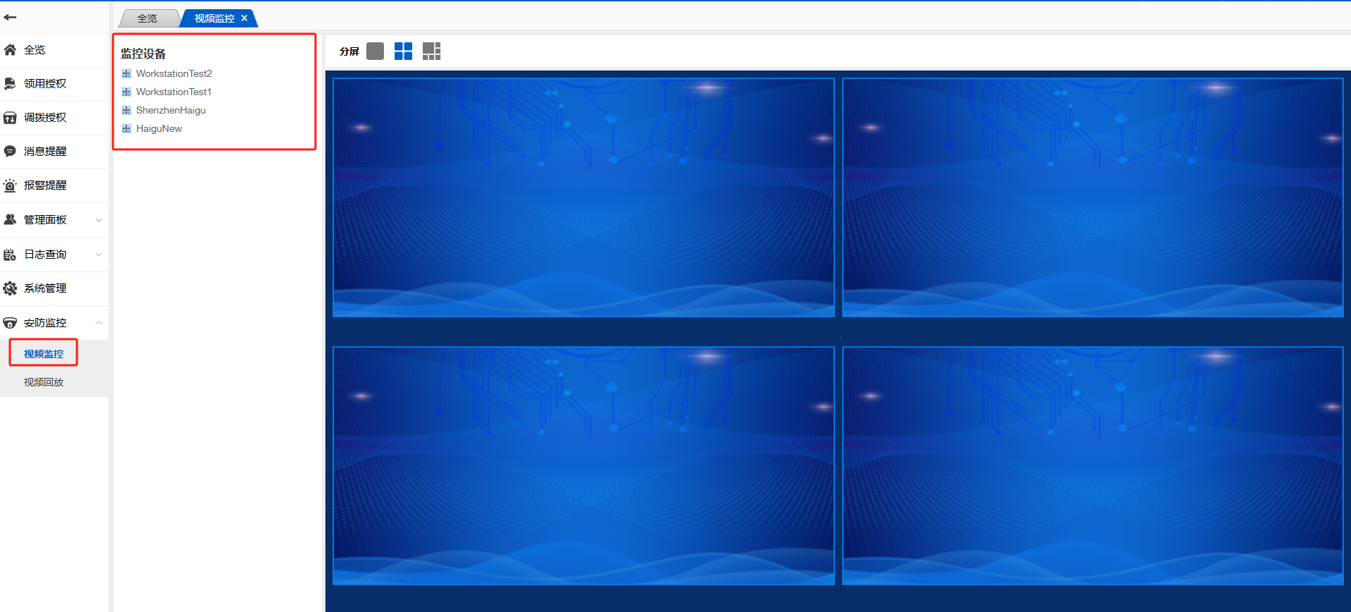 进入到视频监控页面,此模块主要用实时查看运营管理站监控界面。该监控页面,左侧显示该组织下所有的监控设备,右侧可进行分屏选择,页面如下: