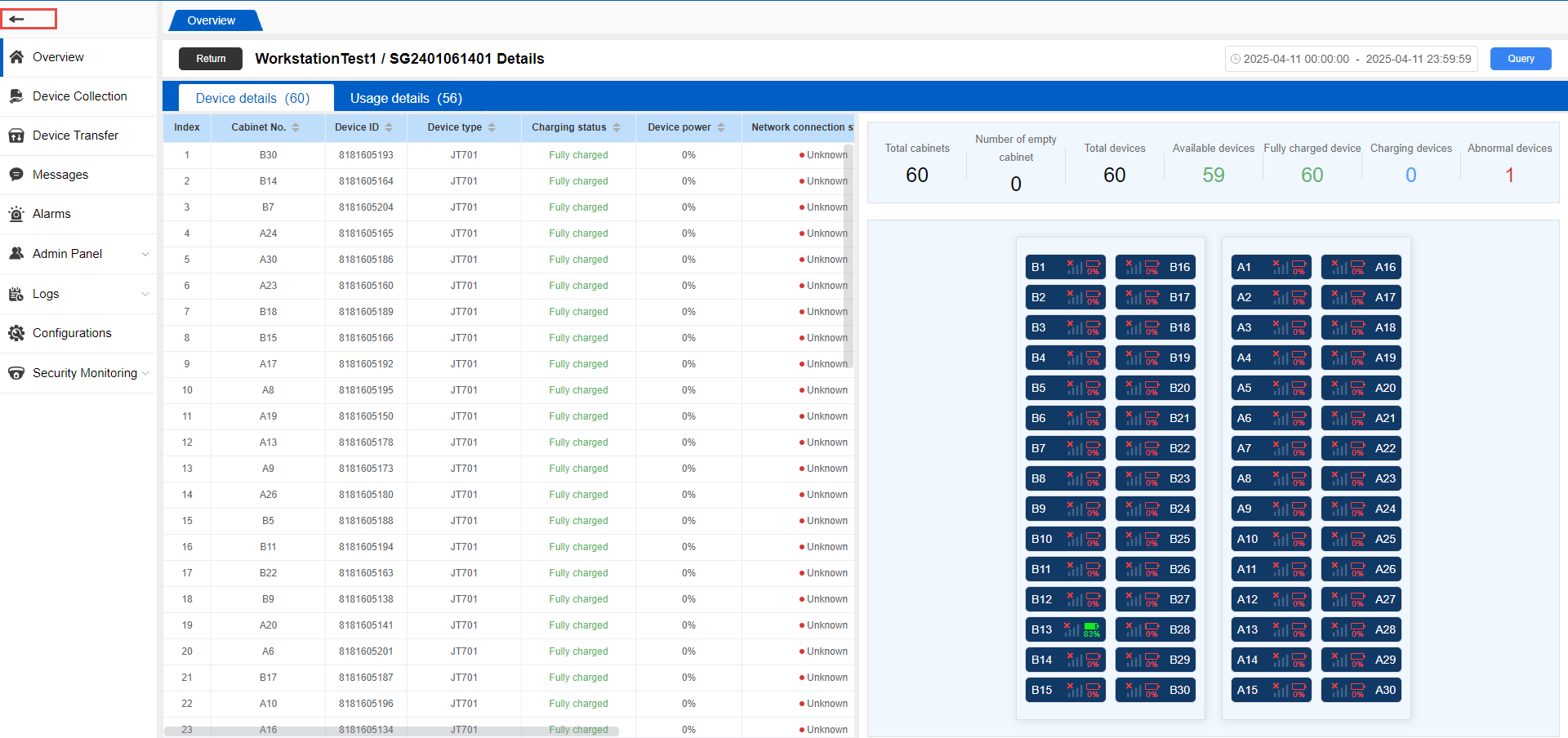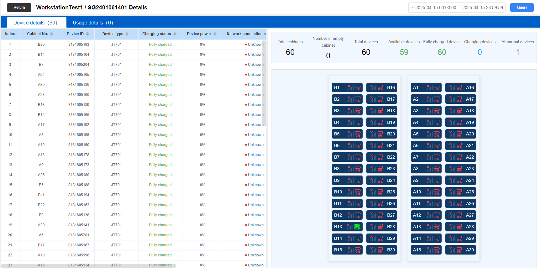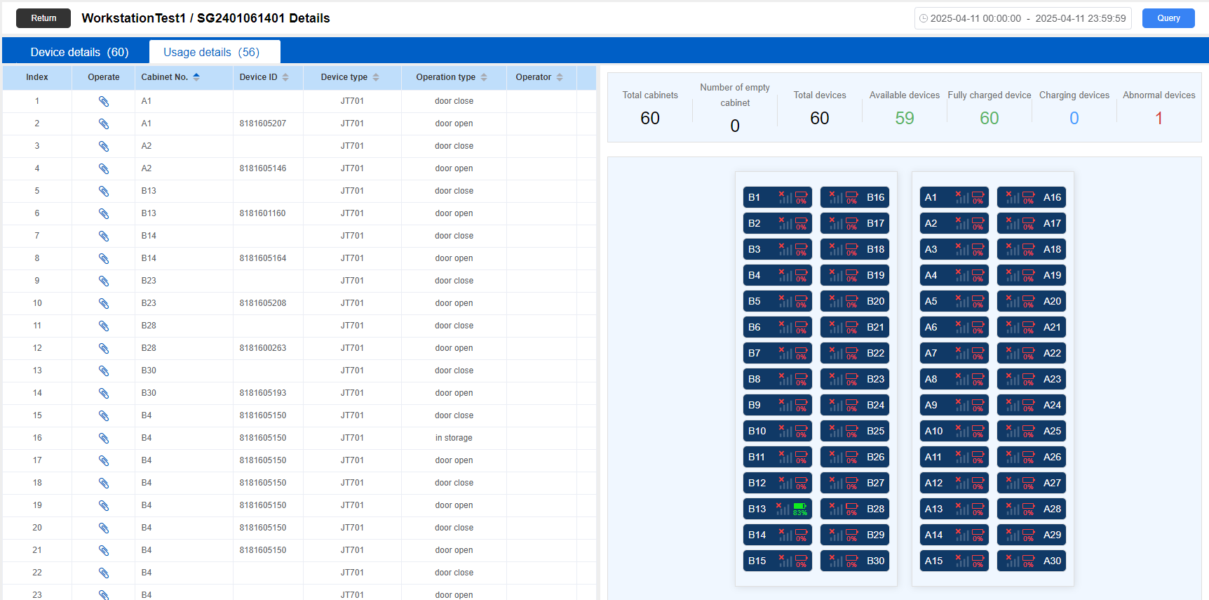 View details: Click the “View details” page in the card to jump to the operation cabinet details page; mainly used to query device details and usage details. Support date filtering query.