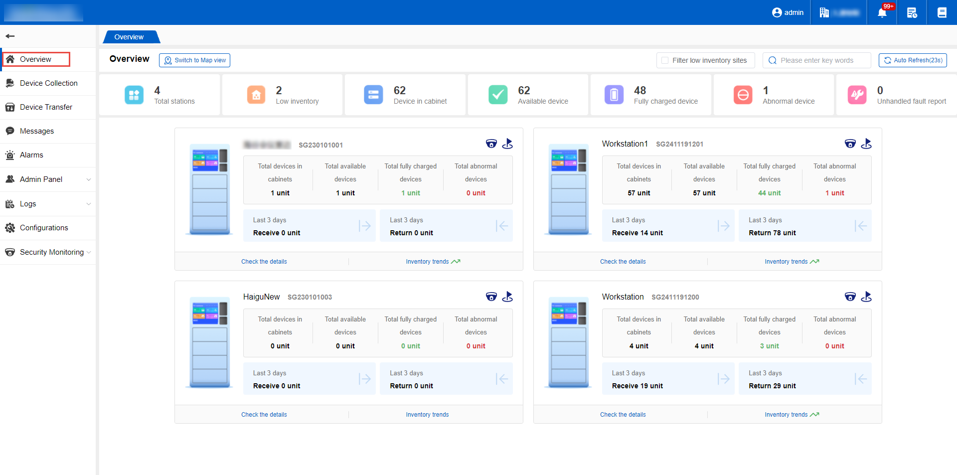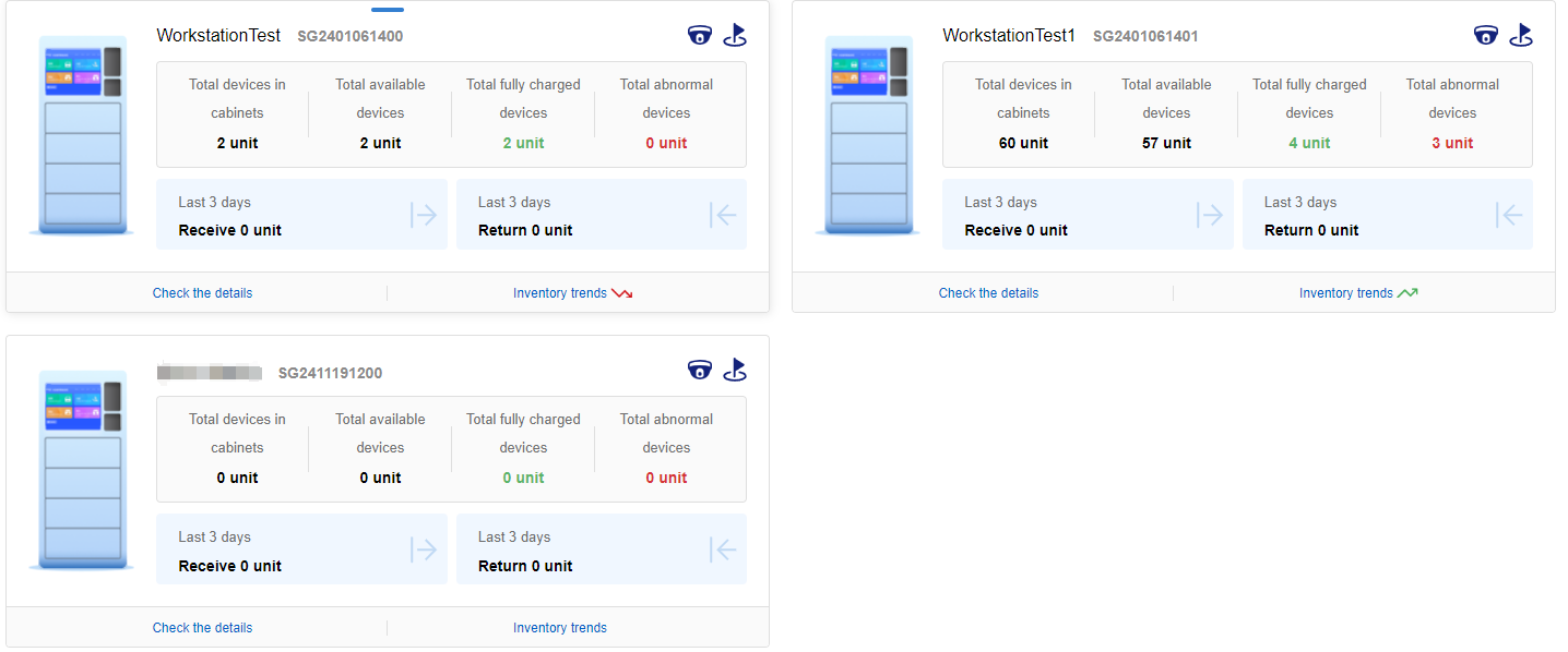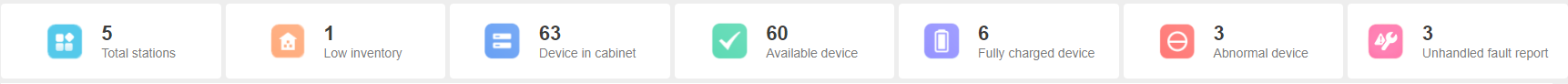 The middle part mainly displays information such as total number of sites, low inventory sites, in-cabinet device, available device, fully charged device, and abnormal device.