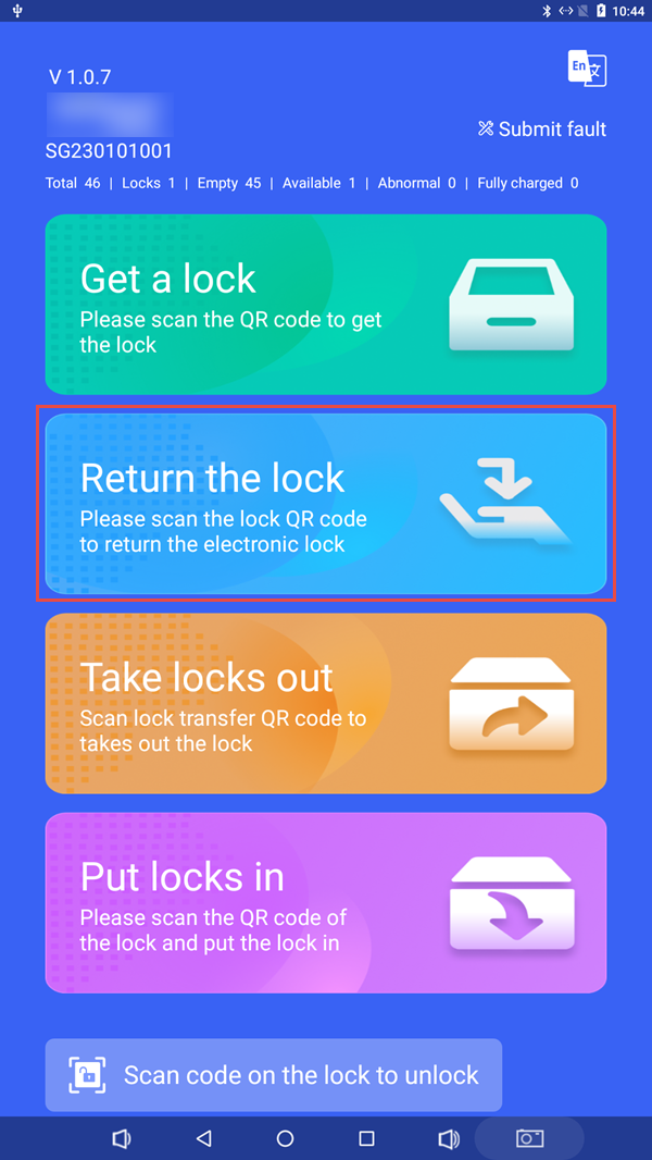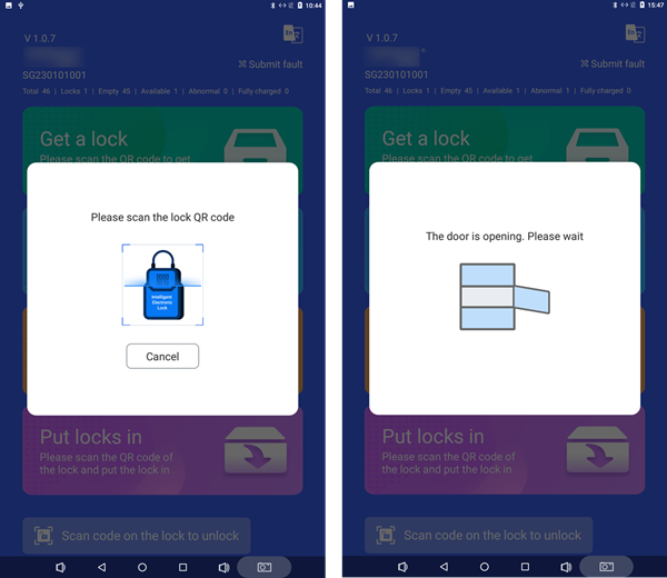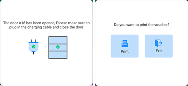 Click ‘Return the lock’ -> prompt ‘Please scan the code to lock the number’. After the return process is met, the cabinet door will open. Put the device into the charging cabinet and close the cabinet door. It will prompt ‘Do you want to print the receipt’ (you can choose not to print).